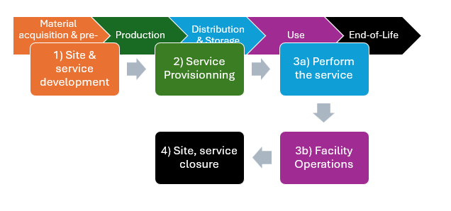 LCA is well known in the manufacturing sector; however, it is less recognised in the service sector, which can lead to missed opportunities. While studying the topic during my sustainability coursework and researching it further, I created the image below to represent how traditional LCA (material acquisition and pre-processing to End-of-Life) applies to services. The four stages are colour-coded to show the connection: 1) preparing the site (construction, renovation); 2) service provision through acquiring resources for delivery (printers, vehicles, computers, desks, etc.); 3a) service delivery by performing the services within the business context; and 3b) facility operations (employees commuting to the offices for functions such as Human Resources, customer services, finance, etc.); and finally 4) site and service closure (switching lease to a new site, disposing of or relocating unused equipment, etc.). I believe this mapping aids understanding and highlights its relevance to the service industry, with a little imagination.